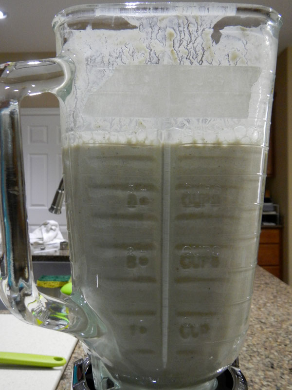 The image is a good example of why you use the water/jar method to put the tape on the blender jar. I didn’t do that. Four cups is a quart, right? Well, first of all, the jar actually held a little bit less because I filled it only to the beginning of the neck. You need to leave enough room to shake it up again later. Secondly, if you look close at the blender jar pictures, you’ll notice actually put the tape in the wrong place! That’s why you see two jars in the image above!